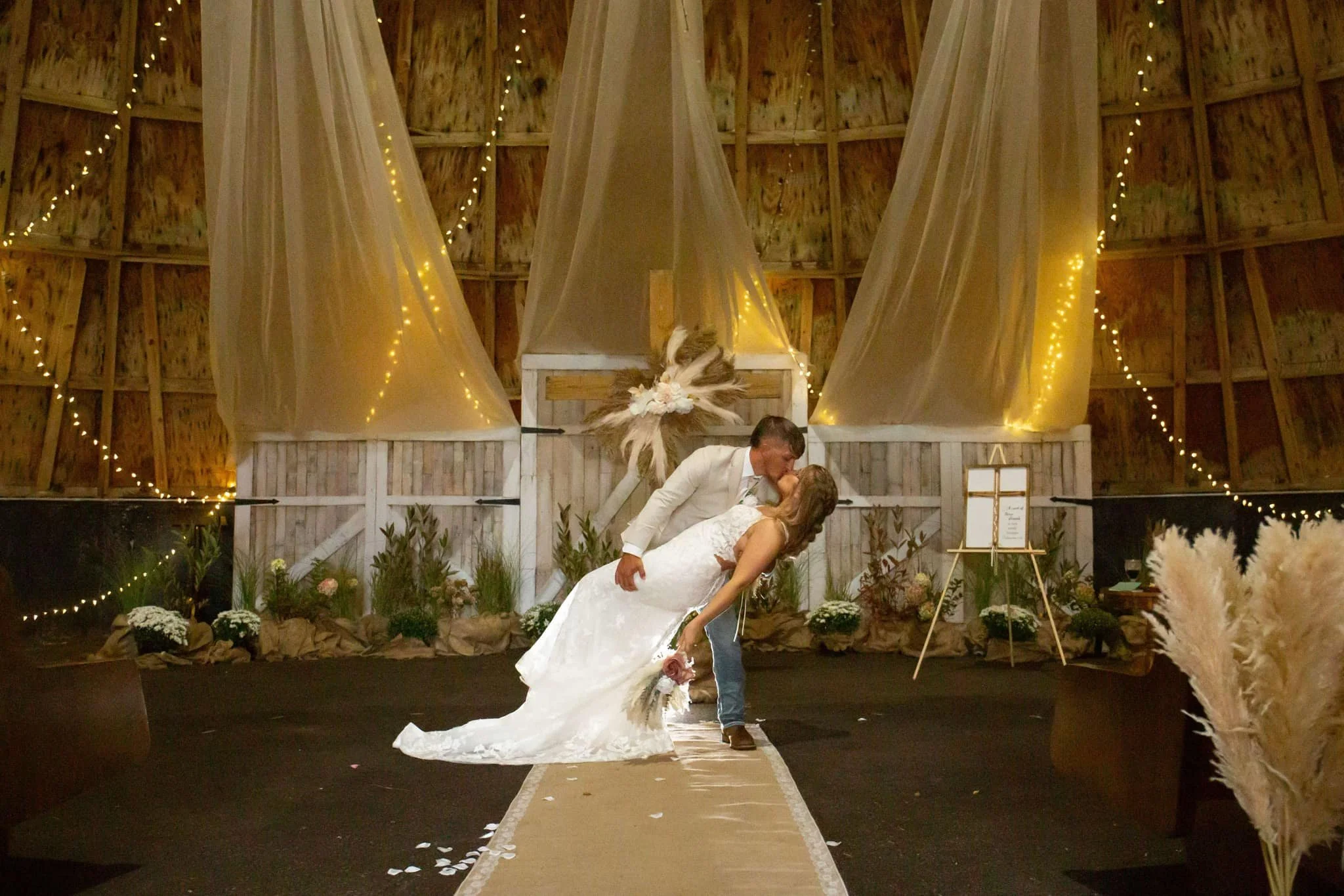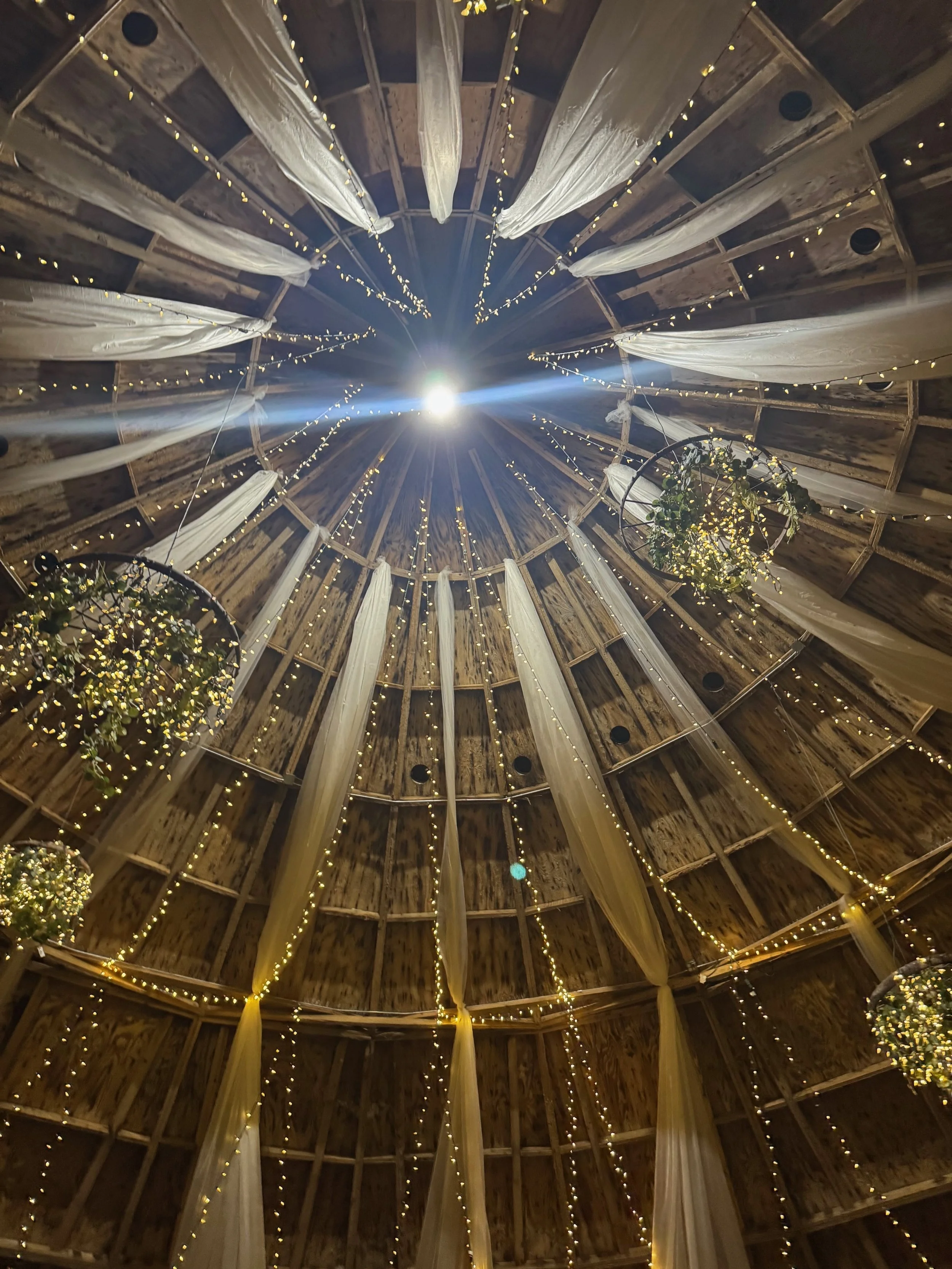 Vaulted 50’ Ceiling, Twinkle Lights & Elegant Ceiling Drape